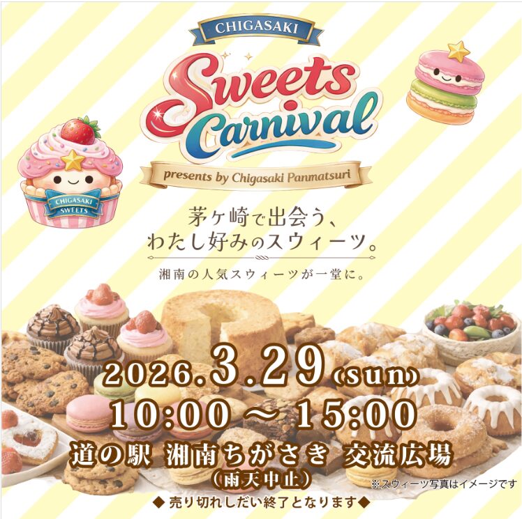 2026年3月29日(日)に、道の駅 湘南ちがさきで「ちがさきスウィーツカーニバル」が初開催されますよ。
