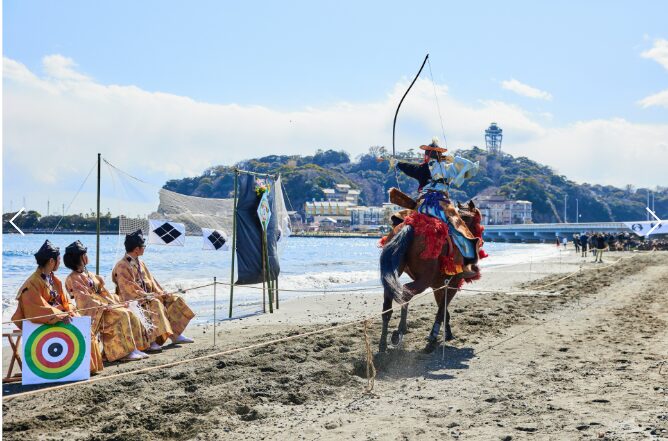 15日(日)には、片瀬海岸東浜で「流鏑馬(やぶさめ)」が披露されます。疾走する馬上から3つの的を次々と射抜くその姿は、まさに勇壮そのもの。