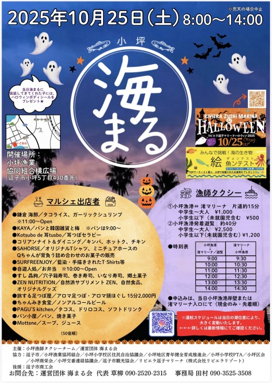 「海まる」は小坪漁港で開催されるハロウィンマルシェで、海産物や地元グルメ、焼き菓子などの屋台が楽しめます。