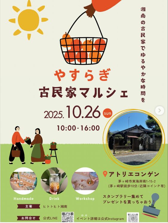 歴史ある古民家のゆったりとした空間で、来場者と出店者が交流しながら、湘南らしいライフスタイルを体感できます。室内や庭に広がるやさしい雰囲気の中、手仕事や人とのつながりを感じられる特別な一日を過ごせます。
