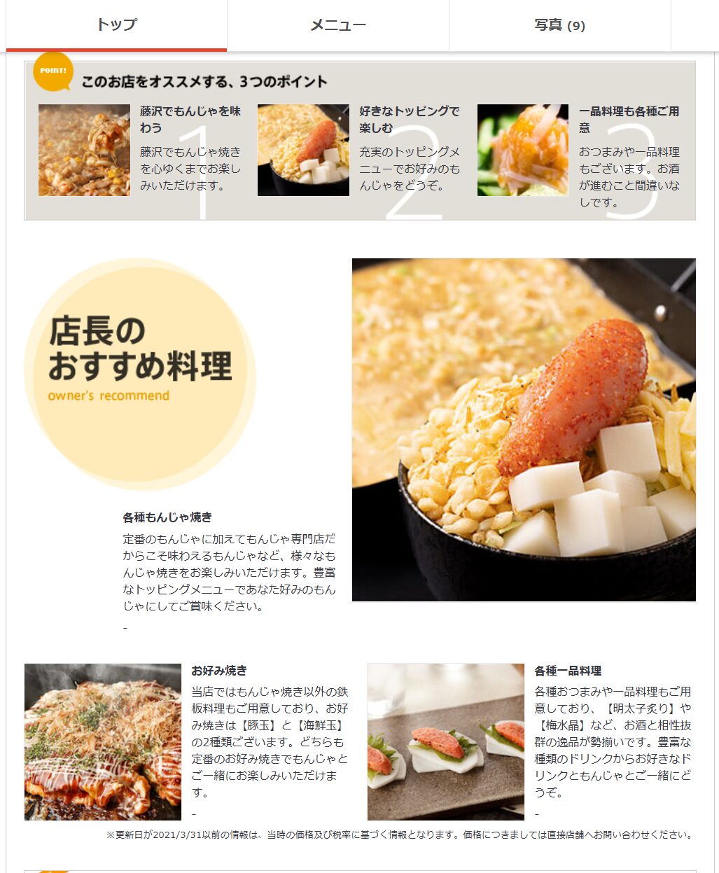 もんじゃ焼きをメインに、鉄板料理や一品料理まで幅広く楽しめるお店みたいです。