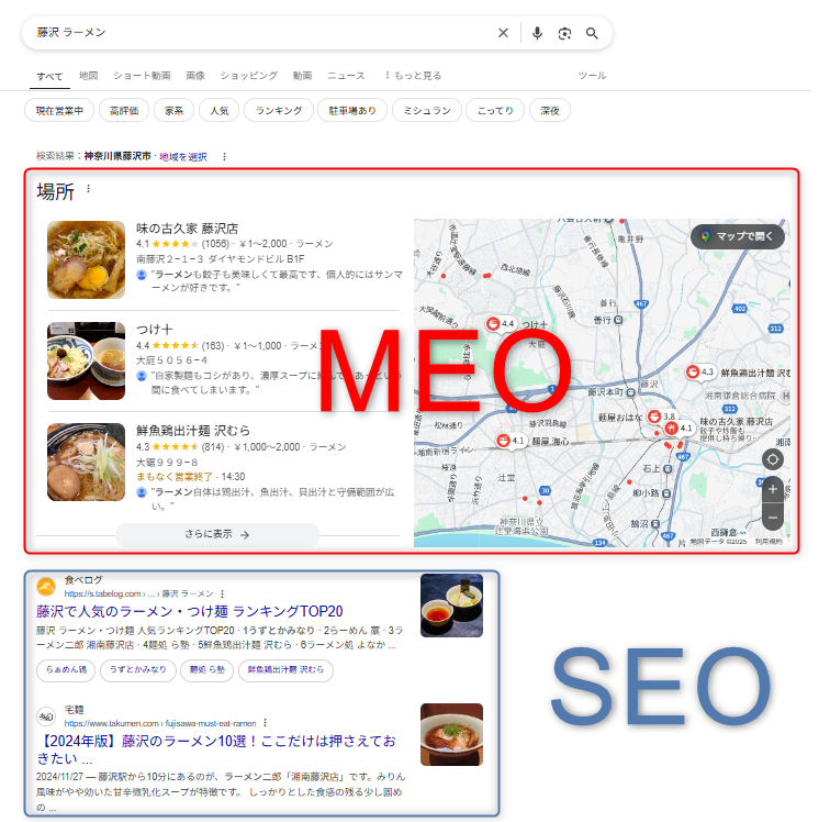 今のGoogle検索エンジンでは、『地域名+サービス(業種)名』で検索すると、検索結果よりも上にGoogleマップが表示されます。例えば、『藤沢 ラーメン』と検索すると、以下のように表示されます。