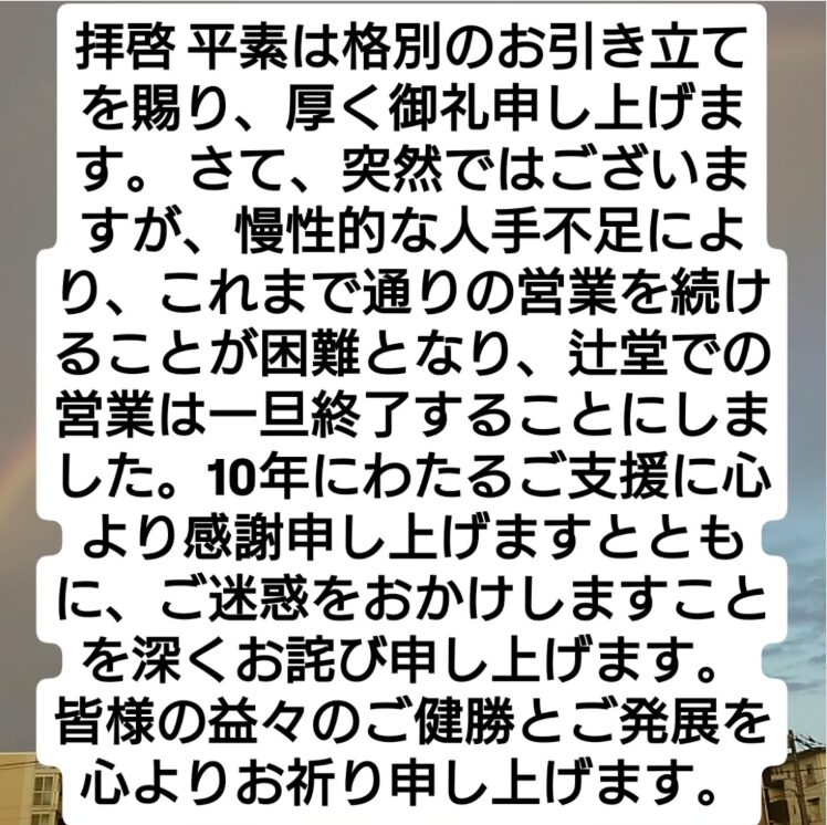 国内店舗約150店舗、海外店舗約40店舗を展開する和菓子の人気店の辻堂店が残念ながら閉店されます。