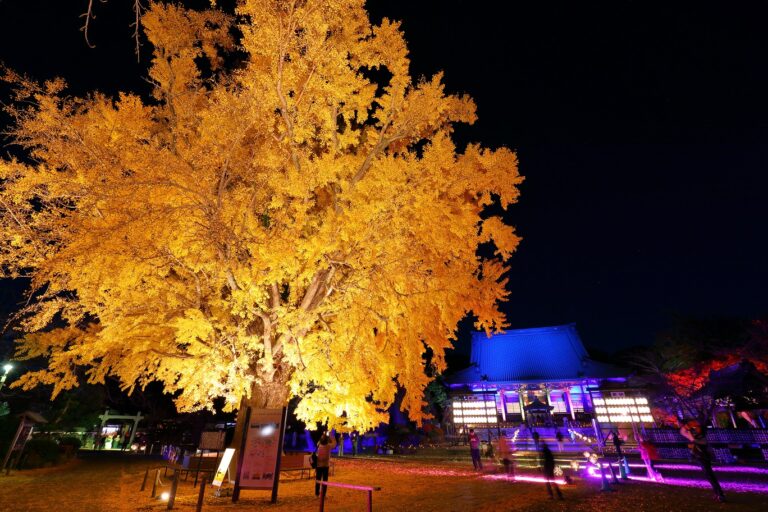 まず絶対に見てほしいのが、遊行寺のシンボルである樹齢700年以上の大イチョウです。黄金色にライトアップされた姿は圧巻で、夜の闇に浮かび上がるその光景はまるで夢の中のよう。